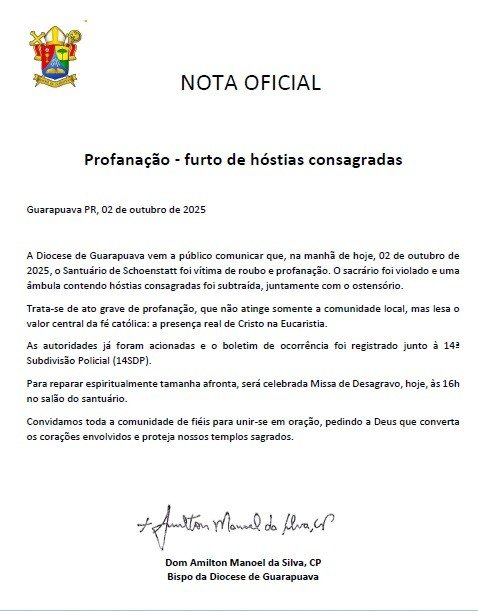 A Diocese de Guarapuava vem a público comunicar que, na manhã de 02 de outubro de 2025, o Santuário de Schoenstatt foi vítima de furto e profanação. O sacrário foi violado e uma ambula contendo hóstias consagradas foi subtraída, juntamente com o ostensório.